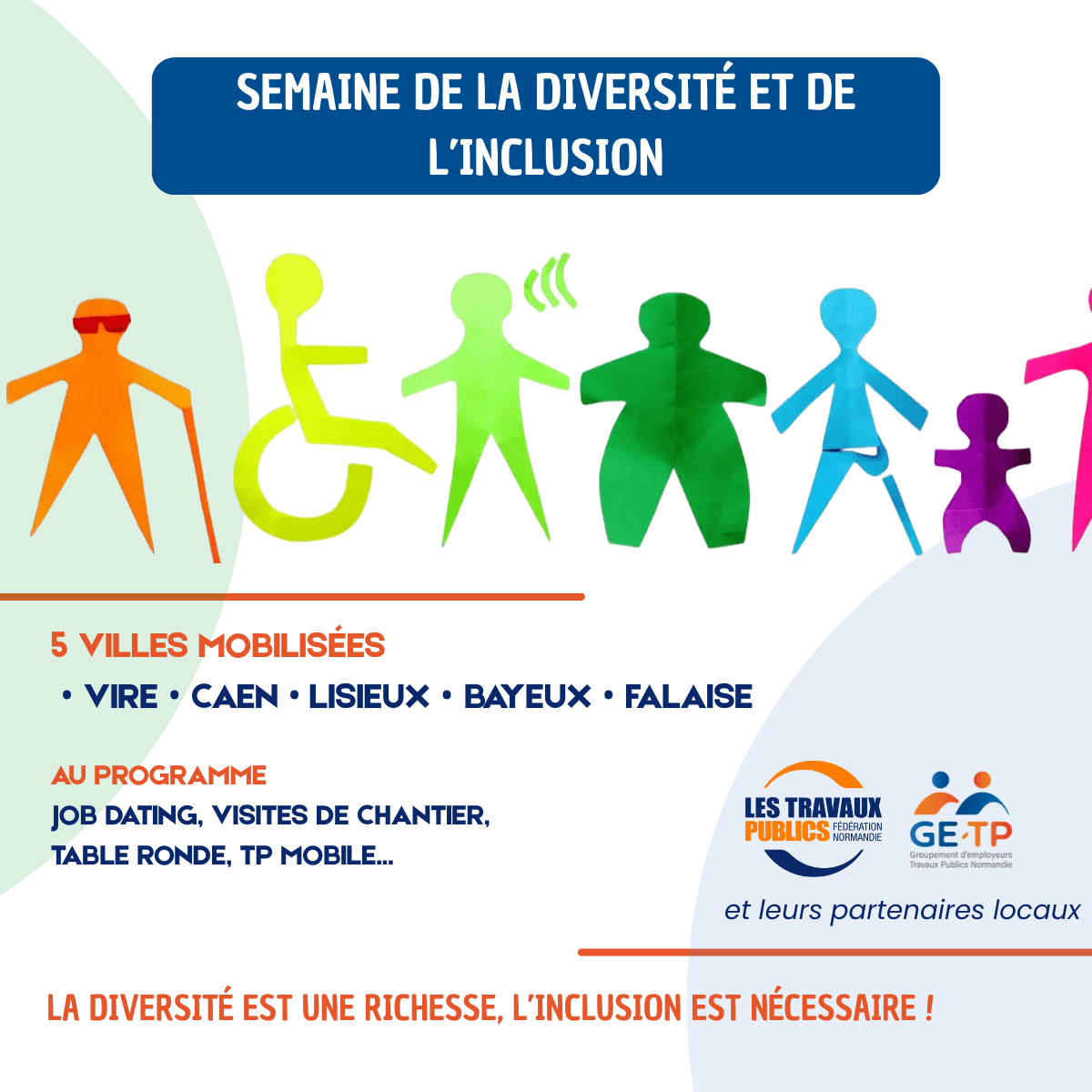 Table ronde, job dating, visites de chantier, présence de la TP Mobile… pendant 5 jours et dans 5 villes du Calvados, les acteurs institutionnels, entreprises de Travaux Publics et partenaires de l’emploi se mobilisent afin de favoriser les échanges et le partage d’expériences autour des actions concrètes menées en faveur de l’égalité des chances et de l’inclusion professionnelle.